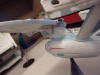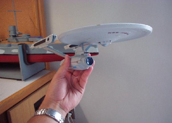 Review: Art Asylum Enterprise NCC-1701-A Art Asylum's new toy lines have breathed new life into the Star Trek toy license, which Playmates had neatly managed to run into the ground. The Enterprise-A is the first edition to their "Starship Legends" line, and boy is it a beauty. The Art Asylum (AA) toy is intended to represent the "Refit Enterprise" studio model as it appeared in Star Trek IV, V, and VI. This model was the same one that was used in the earlier 3 films, save for a different paint job. AA reportedly took measurements and photographs of the actual filming model, to ensure total accuracy. Due to all of the research put into this project, this ship is a stunning visage that blurs the line between model and toy. Opening the rather sharp looking box confronts you with the ship, disassembled into 3 main parts. These include the primary hull/secondary hull assembly, the nacelle pylons, and the nacelles. These pieces snap together quite easily, and fit securely. The fact that the saucer section is permanently joined to the engineering section may disappoint some who would like to use this toy as raw material for conversion projects, but personally I think it really helps the toy from developing that "wiggle" that so many other toys and models of Stat Trek ships seem to develop. The completed toy is of a fairly impressive size. Overall, the ship is about 16" long, and the saucer is 7" in diameter. Until I got mine, I had the hardest time trying to get a feeling for the toy's dimensions, so I included a picture of me holding the thing to demonstrate the relative size of the ship: