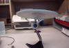 you have never The list of details present in the Enterprise-A is exhausting. First, the "Aztec" pattern of rectangles that were so plainly obvious on the studio model are faithfully represented here. AA, as a cost saving measure, elected to mold this detail into the ship, rather than paint it on. The effect doesn't seem so impressive when you are extremely close to the toy, but from a foot or so away this method makes the toy really look sharp. While we are on the subject of this toy's mold work, AA has painstakingly reproduced every phaser bank, docking port, and view port that was on the studio model. While much of these details remain unpainted, they can be easily highlighted by the owner with a little paint and some patience. Also, rather than paint the entire toy with a base color, AA instead molded it out of a silvery grey plastic. This is, in general, an effective means of capturing the looks of the ship. Using an appropriately colored plastic makes the model easy to re-letter and re-decal, too. This isn't to say that there is no painted-on detail, however. Quite to the contrary, the many blue-gray hull and panel lines that seemed to cover the ship, especially on the dorsal area of the secondary hull, are all present. On top of the paint work are many finely printed decals for the ship's name and registry. These are all crisp and well applied, although the "Enterprise" along the bottom of the main shuttle bay on my toy wasn't perfectly straight. Look at that molded and painted detail! The realism of this toy is definitely far beyond that of many other Star Trek toys. The nacelle pylons seem to be slightly thicker than they should be, probably out of structural necessity. However, all of the other components look to be spot on with all the line plans that I have seen. There is only one screw head visible on the entire toy, and that is on the battery hatch positioned on the bottom of the secondary hull. The battery compartment holds 4 AAA batteries as well as a switch that allows the owner to change it from a "demo" setting (sound but no lights) to the "normal" setting. The toy comes with two hatch covers, one with a socket for the display stand and one without. Regarding the stand, it features the iconic Star Trek arrowhead, and attaches with a ball on a arm to the aforementioned socket in the bottom of the toy. The advantage of such a stand is that it allows for many different viewing positions. However, the joint between the stand and toy is very stiff, and one must apply considerable force to separate the two. Also, the stand is not overly sturdy. I've already noticed small cracks developing along the base of the upright arm that holds the ship. To avoid trouble there, I try not to move the toy too much and place undue stress on the stand. As a toy, the Enterprise A naturally features lights and sound. Separate bulbs light the navigational deflector, the warp engines, the impulse engine, and the large windows behind the bridge. The sounds are designed to represent enemy attacks, weapons fire, warp/impulse propulsion, and transporter operation. Interestingly, the lights come on and off in different patterns depending on the sound being played. This is a very sophisticated set-up, very similar to the one that AA's NX-01 toy uses. The sound effects are all very good, having been ripped straight from the movies. The lights are decent, although they are not perfect. The warp engines, for example, do not uniformly light along their entire length. Instead, the light is concentrated around the aft end of each nacelle, where the bulb is. There are a few other problems with the ship, as well. The decaling and painting is rather sloppily done in some places, although for the most part these areas aren't prominently visible. Also, there are some pretty nasty mold parting lines and seems on the toy. However, these are really relatively minor quibbles against what is otherwise a very fine product. A side-by-side comparison w/ AA's NX-01 ship. Aren't these great toys? Well, to wrap up, I guess I should mention that the refit Constitution design first introduced in Star Trek The Motion Picture has long been my favorite starship design. When I first heard that AA was going to be making a toy version, both my anticipation and expectations went through the roof. Now, I can safely say that AA has met most of those expectations and delivered a ship that, while not perfect, is easily the best toy Star Trek ship yet produced. Considering all of the detail that this toy has, one is almost tempted to call it a model! To say that I am satisfied with AA's Enterprise A is a prize understatement. At only $25-30, no self-respecting Star Trek fan should be without one of these little gems. By Andy Rucker |