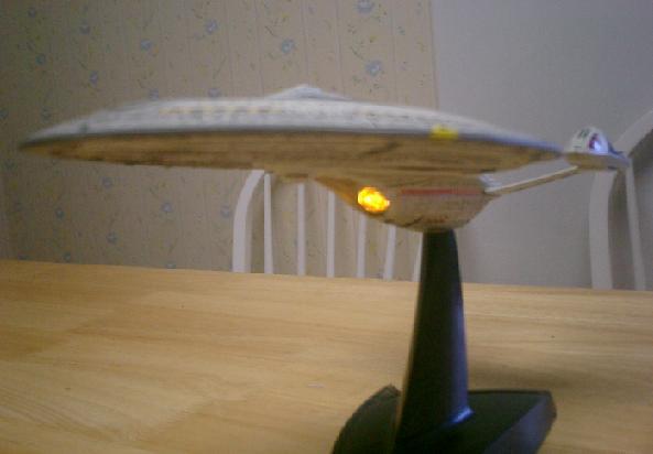 Red Alert! Warbird sighted off the port bow. Mr. Worf, activate the Giant Flashlight! Detail wise, I compared my model with the CG model used in Star Trek Nemesis, and noticed several very slight detail differences. For one, the Aztec pattern on the model is much coarser than the movie ship's is. This is undoubtedly a concession to the smaller scale of the model, however, and doesn't affect the overall appearance of it. Other discrepancies included minor placement issues with the life boat hatches (the yellow pentagons with red outlines) on the ventral side of the secondary hull, and grey areas of the hull are overly dark. And, while I can't be sure, it seemed like I had difficulty matching the model with certain CG shots from the movie, specifically the shots taken from an aft perspective towards the end of the movie as the Scimitar is overtaking the Enterprise. However, given how well the model stacks up to most of the other shots, I am almost persuaded to think that the problem lies with an rendering error in the movie. On the whole though, these issues with the lighting and detail are really nit-picky concerns that don't detract from the beauty of the model. As I said, the lighting is good enough to give an impression of a studio miniature, and the details are close enough to make the model a dead ringer to the on screen ship. I had to examine freeze-frames of the Star Trek Nemesis DVD just to find the few small issues that did! In fact, there is a lot more that is right about this model than is wrong with it. For example, in those freeze frames I also happened to notice that all the windows are exactly where they are supposed to be! The first time I saw the Enterprise-E on screen in Star Trek First Contact, I just new I had to have a model of it. This kit produces a miniature that is easy to assemble, beautifully lit and decorated, and reasonably large at around 16" in length. The only real shortcoming of the kit is that it is pretty pricey. I bought mine in Akihabara, Japan for 6,000 yen (about $55), but it will cost significantly more through online retailers and I have yet to see this kit in American stores. Nevertheless, my recommendation is that it is worth the cost and hassle to find this superb kit. By Andy Rucker