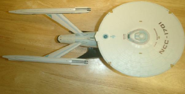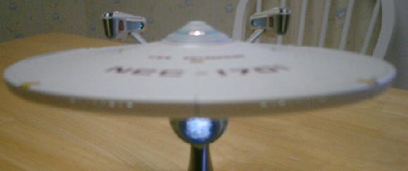 The parts of the model all fit very tightly, but getting that fit can be difficult because of the wires from the light bulbs inside tend to get in the way. This is especially a concern with the primary hull. The wires must be carefully aligned and routed so as to not interfere with the post or hole of one of the pieces. It took some considerable doing for me to get my model's parts to seat right, so those with little patience beware. The lighting effects are well done, but for some reason the lens for the deflector comes in clear as opposed to blue plastic. I tinted mine, in order to avoid the same "flashlight" effect that Bandai's Enterprise-E attains. With the recent increase in the number of model Star Trek ships available, comparisons are inevitable. Comparing this model to Bandai's Enterprise E is telling, because the release of this model actually preceded that of the Enterprise-E. Consequently, this model has many shortcomings that the Enterprise-E kit does not. In addition to those mentioned above, this kit's parts fit wasn't as rock-solid as the E's was. The warp nacelles in particular have a tenuous hold at best on their sockets in the primary hull. The refit Enterprise kit, like the E, can only be lit when it is attached to its base. Also, the lighting scheme makes no attempt to recreate the self illumination employed by Federation ships on screen. The lack of this effect is much more noticeable on the Refit Enterprise because it featured more of it than the E did, and it was displayed much more prominently in the movies, as well. I'm also tempted to compare this model to Art Asylum's Enterprise-A toy. While Art Asylum's offering is an affordably toy and this is clearly intended to be more of a pricier desk model, Art Asylum's A features a number of surface details that are strangely absent from Bandai's kit. This difference is especially noticeable on the housing of the warp deflection crystal. However, the paint and markings on Bandai's ship are far superior to those of the Art Asylum toy. And while both ships feature a representation of the Aztec molting pattern on their hulls, I thing I prefer the painted-on patterns of Bandai's Enterprise to the cast-in approach taken by Art Asylum. Yeah, this kit does have its shortcomings, but if you like the design of this ship as much as I do, you will still find it a worthwhile investment. Just watch out for the wires! By: Andy Rucker, 14 July 2004