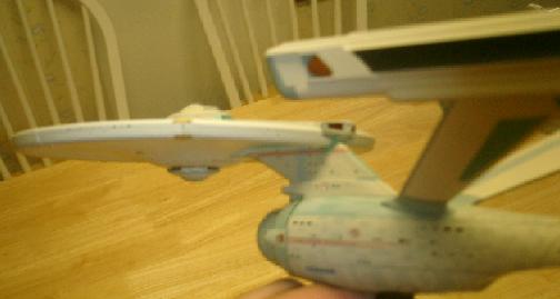 The refit version of the USS Enterprise unveiled in Star Trek: The Motion Picture has long been my favorite Star Trek ship. When I first heard that Bandai was going to be producing a fully painted model of it, my curiosity was naturally piqued. After having gotten my hands on it, I can safely say that this model nicely recreates the sleek lines of the ship. This model shares a lot in common with Bandai's Enterprise-E kit, such as being lit, pre-painted, and of snap-construction. The paint on this model is very well done, including a lot of details that were barely visible on screen, such as the patterns around the base of the connecting dorsal. The markings, unfortunately, leave a little bit to be desired. For example, the red stripes extending from the Starfleet logo on either side of the primary hull do not taper as they do on the studio model, and the lower stripe is too long. Additionally, the red stripes girding the base of the bridge model are not in exactly the right spot. None of these discrepancies are so glaring as to detract from the overall look of the model, but they are slightly annoying to an obsessive fan such as myself ;).