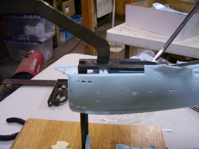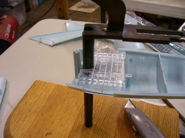 the brace laid out on the plywood. Once the brace was cut out and ready to go, I glued it to the bottom of the "shelf" on the forward end of the cargo bay unit using a little 5-minute epoxy. I attached the brace while the bottom of the hull and the arboretum were positioned on the armature, so that I could be certain that the brace was contacting the armature and doing its job. To hold the brace in place while the epoxy dried, I used a couple of spring clamps. By the way, that big piece of wood that the armature is stuck in is a hunk of an old kitchen cutting board that I was laying around my Dad's shop (Don't ask...) that I am using a temporary base for the model.