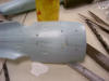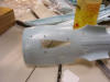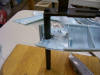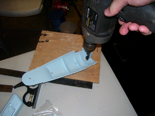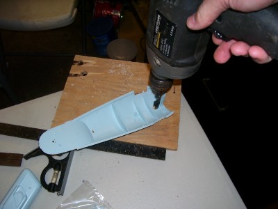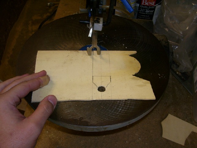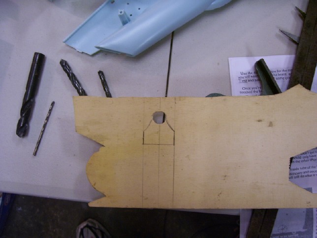 just a little too big! The instructions suggest making the brace out of sheet styrene, but I used 1/8" aircraft plywood since I had that on hand and thought it might give more support than a plastic one. I first drilled out the 1/2" hole (using much the same method as I described above), and then laid out the rest of the brace around that hole using the detailed template included in the instruction sheet. I then cut out the brace using a jig saw.