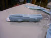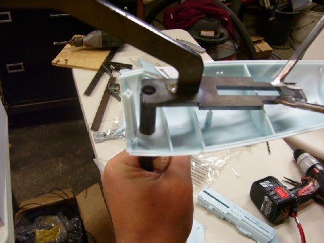 Given that I am going to be putting so much effort into this model and that by virtue of my job it is going to get moved quite a bit, I decided to purchase one of the metal armatures developed by a guy on the HobbyTalk message boards and available from CultlTVMan. When I finally got my hands on the armature, I realized that it was going to take more work to get it fitted to the model than I had expected. Thus, I worked on this part of the model while I was home in Indiana and had the resources of my Dad's shop to help me. Still, the process went pretty smoothly. Following the directions included with the armature, the first step I took was to open up a hole in the bottom of the model for the rod of the armature to pass through (see above and below). Since the kit comes with two of these pieces (one for the early version of the ship and one for the later), I decided to use the one I wasn't putting in the model as a practice piece. The instructions warn that the sizing and placement of this hole is vital, so I didn't want to mess it up! I used five different bit sizes, using a small bit to first drill a pilot hole and then opening up that small hole with progressively larger bits. As it turned out, my final hole was slightly off (it should be just a bit farther forward, right against that vertical post you see in the picture below). But it didn't affect the overall fit of the armature near as I can tell, so no worries..