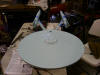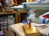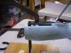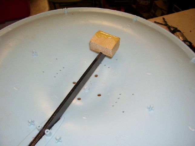 the pencil outline of the opening. After the openings in the saucer and engineering sections were made, I test fitted the saucer. The armature supports the saucer from the upper half, but it needs a shim to do so. While the instructions suggested using a plastic shim, I again substituted wood. I used a small wood block with a grove cut in the bottom so that it would balance on the blade of the armature. I applied some epoxy to the top of the wood block and fitted the model around the armature. Then, using a long screwdriver, I reached through the opening for the VIP lounge in the back of the saucer and pushed the wood block forward until it came in contact with the top of the saucer. I then left the model taped and clamped until the epoxy dried. Above: Here is the block right before the upper half of the saucer was put on. Once the saucer was shimmed in place, I could test fit the whole model around the armature (with the aid of a few Starfleet approved "uni-directional bonding strips"). There turned out to be a few gaps that will definitely have to be filled, but I think many of them can be made smaller or even eliminated during the gluing process. The process of fitting the armature took a full day's work (ah, I love vacation!), but I think the result was definitely worth it.