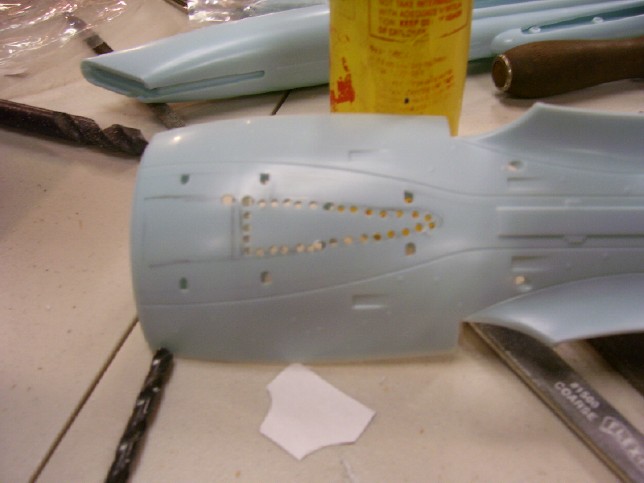 The next step was to create small openings in the end of the nacelle pylons to allow the armature to pass through. This was actually pretty easy to do with a Dremel, but during this step I had to make several adjustment to the angle of the nacelle supports on the armature. While it can be bent by hand, I actually had to adjust the twist of the metal pieces of mine. This required chucking the armature in a vise, which would have been impossible had I been at home. After the pylons were straitened around and fitted, I opened up the top of the secondary hull and the bottom of the saucer where they meet the neck to enable the armature to pass through there. The method I used was to first trace the outline of the opening I wanted with a pencil. Then, I used a drill and a small bit to make a series of holes along that line. I then used a razor knife to "connect the dots" and create a rough opening that I then cleaned up with a file. On the top of the secondary hull, a cross brace has to be left because it will be used to transfer the model's weight to the armature. Once I got done with the engineering section, I repeated the process for the lower half of the saucer section.