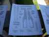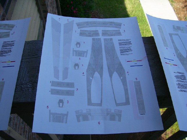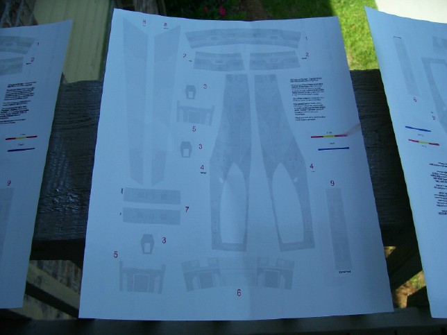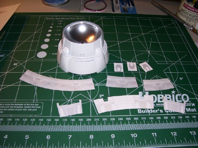 the dish frosted. Notice how the translucency distributes light. The deflector housing is covered in some rather intricate aztecing. The set of masks that I got from CultTVMan includes masks for this area, but thanks to the Hobbytalk board I managed to stumble upon a better solution. Instead of painting the aztec pattern in this area, I would use decals. A gentleman by the name of Matt Fletcher came up with a very precise set of graphics that replicate the markings on the deflector housing and strong back of the Refit Enterprise studio model and they are available for free downloading at the Starship Modeler website. After I downloaded them, I printed them out on special 8 1/2" by 11" white decal paper. However, to prevent the ink from smearing when the decals are immersed in water, they have to be sealed with a clear lacquer first. I wound up printing several sheets as I played around with color and quality settings, and it looks like I'm going to be incorporating different parts of each sheet into the model.