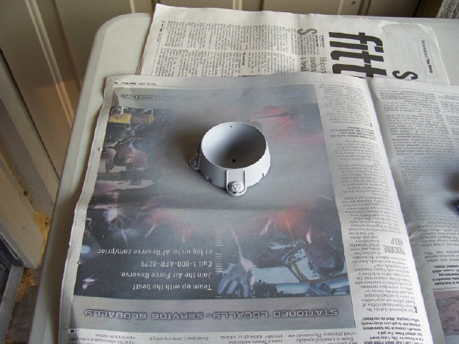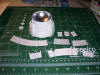 The Deflector 24 June 2006 This time around I am tackling what I consider one of the most important areas of the model that I want to get just right. The deflector dish area of the ship is very noticeable, since it is a large area in the front of the ship that is going to be lit blue. Two particular effects I wanted to achieve where the ring of small lights around the rim of the main dish and the two concentric black rings around the housing. So, I started with the housing first. I primed the whole thing grey, and then masked it so I could paint the concave portion behind the dish with Rustoleum chrome paint to better spread the light around. The clear dish actually fits into the housing by about an 1/8" so I also masked the area so it would remain grey as well. To accomplish the ring effect, I first tried painting the housing black from straight down, then the white from the sides. The rings are inset deeply enough that this actually worked to a degree. However, it proved impossible to get an even enough coat of Gloss White without covering up part of the black in the rings. So, I painted the whole thing white, and then scraped the white paint away from the rings with an Xacto knife. This produced a decent look, but I decided to touch up the outer ring with a small brush and black paint. In the end, it probably would have been better to paint them this way from the beginning!