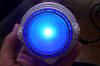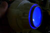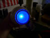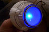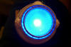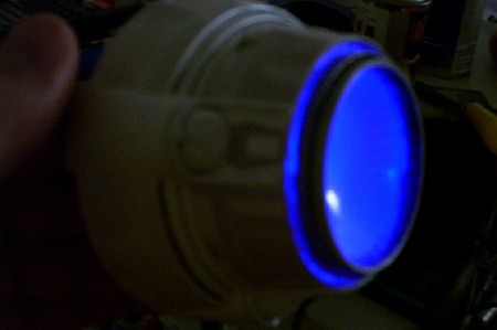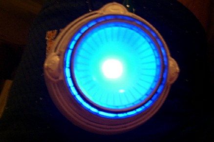 the housing and the decals that will be going on to it. Once the decals where applied, I decided to play with the lighting. I suppose this is as good a time as any to talk about my philosophy on the deflector lighting. The ship's deflector was almost always blue, except for certain scenes of Star Trek: The Motion Picture (TMP). In that movie, the ship's deflector had a copper glow while she was on impulse power, and it didn't turn blue until right before she went to warp speed. While she was at warp, the dish remained blue. However, in subsequent movies, the deflector always glowed blue, no matter what (the only exceptions being the stock footage from TMP that was re-used at the beginning of The Wrath of Kahn). A lot of really nice refit models I have been seeing are using two different LED's in the dish to represent the two different lighting colors seen on the studio model, with an amber LED used to represent the copper glow. For my model, however, I am planning to represent the ship traveling at warp speed. Thus, I am planning on having my dish only glow blue (plus, I like the look of a blue glow a lot more!). For this lighting test, I tried two blue LED's of differing intensities to see how each looked.