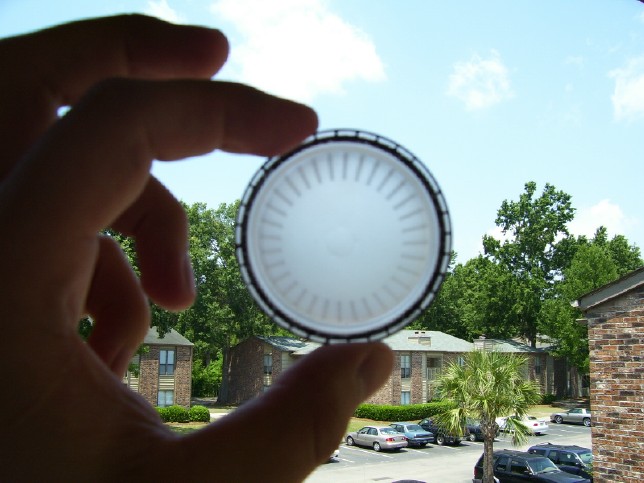 LED. The first step was opening up the whole in the part to accept a 5 mm LED. After that, I prepped the LED's by filing the rounded convex tips flat and then used a drill bit to actually give the LED a concave surface. These steps, combined with the frosting of the clear part, really help to more evenly distribute light around the whole of the dish. I under-drove both LEDs during the test (that is, used less current to light them than they are rated for). However, even though it was significantly under-driven the brighter LED was just too bright for my taste. Not only was the hot spot in the middle larger, it actually hurt to look it! In contrast, the glow effect from the lower intensity one looks very nice in person, and in the pictures I think it is almost dead-on to how the deflector looks in the movies.