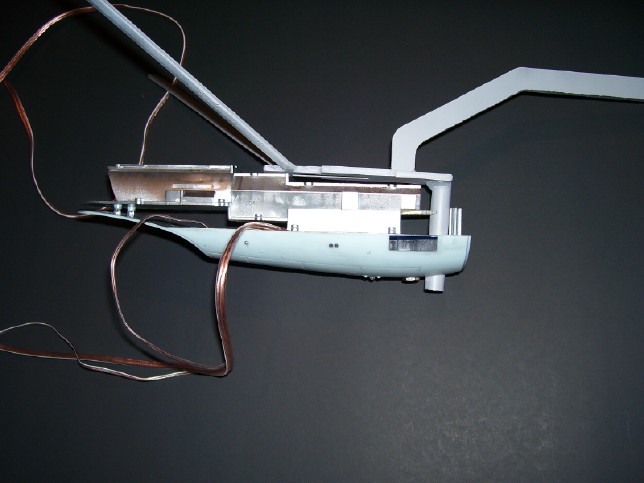 did to mine! The next task was to trim the armature to the correct length. I only wanted the bare minimum showing out of the bottom of the model when completed, so I test-fitted a few of the key parts, marked the metal tubing of the armature, and cut it with a tubing cutter. As it turns out, I got the length just about right! After I trimmed the armature, I also gave it a coat of grey primer. This model will likely be spending a lot of time in humid climates, and I don't want the steel in the armature to rust on me. After trimming the armature, I installed the arboretum room and docking bay assembly. The docking bay assembly and engineering hull parts were chromed using the Rustoleum paint in order to reflect light more inside the model. This allows me to get away with using fewer LEDs to light the windows of the kit. Above: The foundations for assembly have been laid. Now that I had gotten this far, I wired up the internal lighting harness for this section. The windows on my model are lit with four 5 mm white LED's arranged along the sides of the docking bay unit. These LED's also provide the light for the arboretum. There are also 4 3mm white LED's to provide a spotlighting effect on the warp nacelle support pylons. Finally, a red LED illuminates the docking control windows above the hangar bay doors, and a specially modified blue LED illuminates the deflector in front. I try to get away with using as few LEDs as possible in order to save time, money, and most importantly, complexity. Even with a model this size, it can be hard to find enough room for all the LED's and their associated wiring! All of the windows in the engineering section have been given a coat of liquid mask, so that they can be painted right over when this portion of the model is painted and then simply un-masked later.