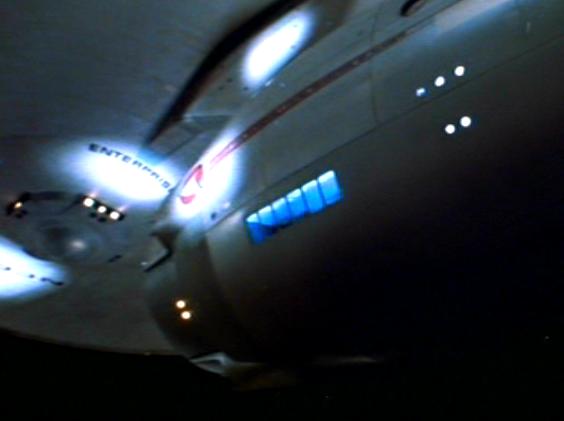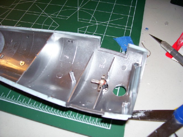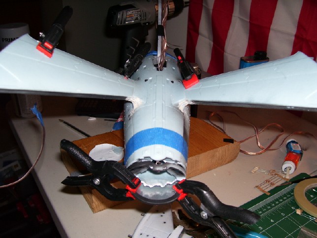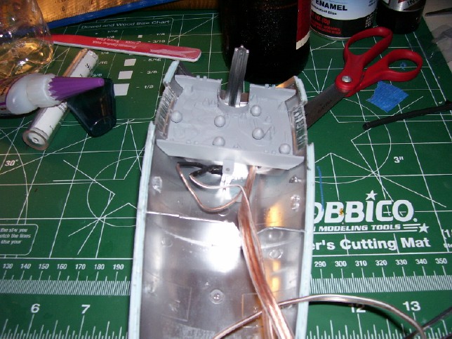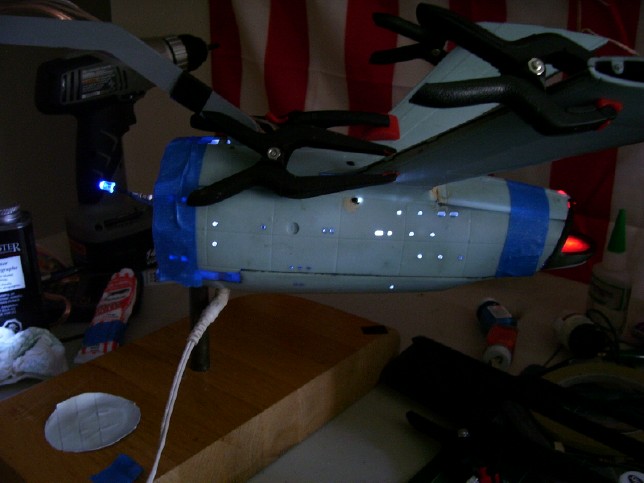 the arrangement of the 5 mm white LED's. Once I had the wiring part figured out, it was time to assemble the rest of the engineering hull. Earlier, I had glued the upper and lower halves of the pylons to the top section and side sections, respectively. Now, I attached the sides first, and then the top. Before I attached the top, though, I ran the wiring along the inside of the pylons for the lights in the warp engines. Once all four pieces of the engineering section were in place, I clamped and taped them together in order to minimize and gapping that might have taken place during drying. I did still get a couple of seams, which I dealt with in a couple of ways. First, large gaps existed around the base of the pylons. Those just had to go, so I used putty to fill the joints and then sanded them smooth. Next, small light leaks existed along the bottom edge of the sides. These I corrected by placing a strip of electrical tape along the offending joint using a pair of long tweezers. Finally, there were a few minor light leaks that I have decided to live with, as they are very small and/or can only be seen from awkward viewing angles. I actually wound up removing a portion of the after end of the hangar bay floor to get the end cap to fit better. This cut is visible below and is pretty rough, but I don't mind since it isn't going to show in the final model anyways. I am trying something different with the pylon spots. As with the strobes, I drilled out the holes in the sides and I am using the LED rather than the clear plastic part included with the kit. Rather than try to mask the LED, I actually brush-painted it black before installation. The idea is to paint over it, and then once the painting process is completed plan to take a small file or sanding stick and remove the paint a little bit at a time to get the spotlighting effect seen in the movies.
