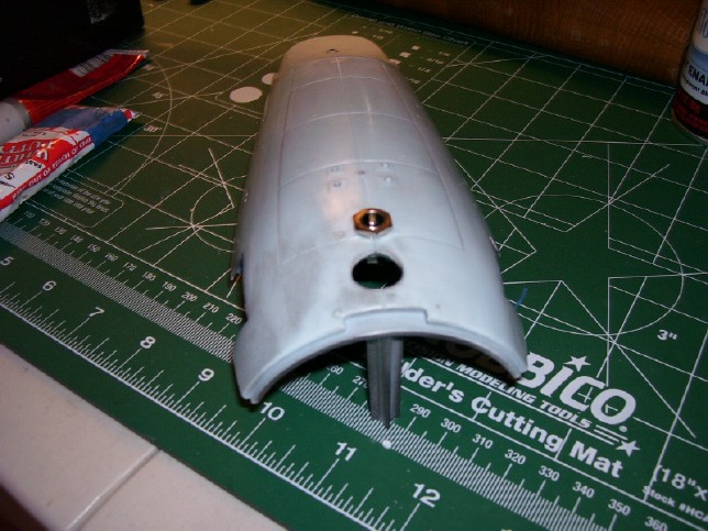 how the jack for the power supply looks from the outside. I am using speaker wire to run much of the lighting in the model, and I attached the main power leads to the jack at this point. I also wired and installed the ventral strobe LED, as this area is inaccessible once the docking bay assembly is in place. In order to make the strobe more visible, I drilled out the hole for the clear plastic insert and instead will just use the 3mm LED itself. While I will be losing a slight amount of surface detail with this method, I think the higher visibility of the LED strobe effect is worth the trade off. Once I got these two elements wired, I cut a notch in the "bulkhead" that transverses the bottom piece to route the wires through. I then installed the arboretum. Many modelers have been going all out in detailing their arboretums, but the detail is hardly visible through the outer windows. Also, in the movies the windows are either dark or lit blue with indistinct shapes barely visible inside. To capture this effect, I am leaving mine a basic grey and lighting it with clear LEDs shining through a frosted, translucent blue ceiling.