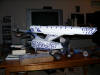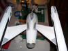 Painting the Engineering Section 06 September 2006 After having successfully painted the neck for my model, it was now time to begin the painting in earnest. This time, I sought to apply my aztecing technique to the engineering hull. Before I could begin masking the Aztec, however, I had to properly mask the whole assembly. This included the opening on the bow where the deflector dish will be fitted, the opening on top where the neck attaches, and the warp grills. As I mentioned during the article on assembling the engineering hull, the masking tape I used (the blue Scotch painter's tape) pulled some of the black paint off the grills. This necessitated a touch up when the masking was removed, but it didn't turn out to be the end of the world. Once the masking was done, I first primed the whole assembly with grey primer, followed by a couple of coats of flat white. I mentioned in my last update on painting the neck that I felt like I didn't put enough coats of flat white down to cover the grey, and as a result the Aztec pattern came out a little bolder than I had planned. To correct this issue, I put down a few more coats to get a better covering. The picture below shows the model with only one coat, and you can see how the grey is still peaking through quite a bit.