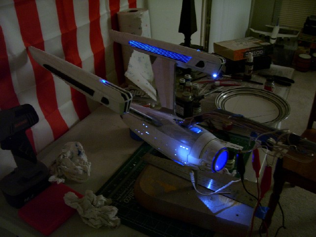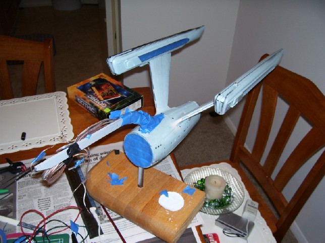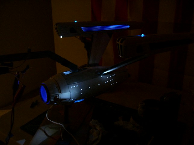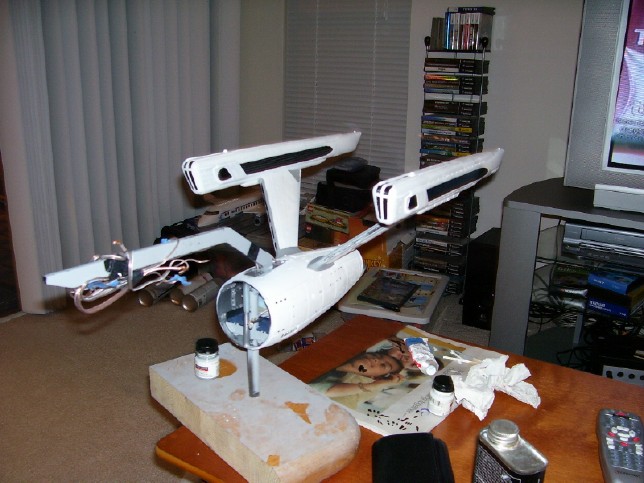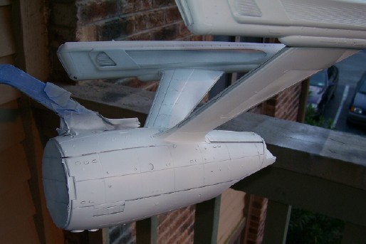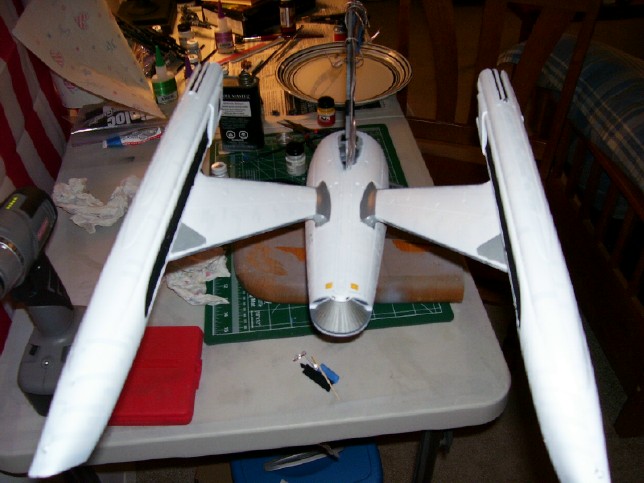 since there is not a set pattern. I like my solution! After laying down a few coats of gloss white and un-masking the model (a process that takes almost as long as masking it!), it was time to do the detail painting. This included painting the non-lit grill areas of the warp nacelles gloss black, and parts of the warp nacelle pylons dark grey. My painting on these areas came out fairly well, but there are a few touch ups I will need to do later. Also, looking back I think I should have used a lighter shade of grey on the pylons, especially on the leading edges and bases of the pylons. It doesn't look half bad as-is, though.