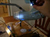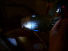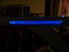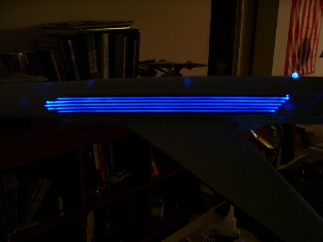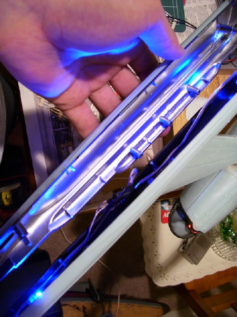 Positioning the LED The next step was to work out the blue LEDs for the crystal on the top and the gill. For the crystal on the top, I simply used an under-driven 5mm blue LED (the hole in the model is the perfect size for one). As for the grill, the major concern was to achieve an even glow along the whole length of the grill. To achieve this, I frosted the inside of the grill and painted the inside of the outboard halves of the nacelles, with some of that Rustoleum chrome paint I have been using. I was also planning on using 4-6 blue LEDs, with 2 or 3 on each end of the grill and pointed at different angles. However, once I started wiring the thing, I discovered I only needed one LED on each end of the nacelle to get the affect I wanted. Sweet! Only having to use 2 LED's on the grill simplified the wiring considerably.
