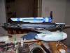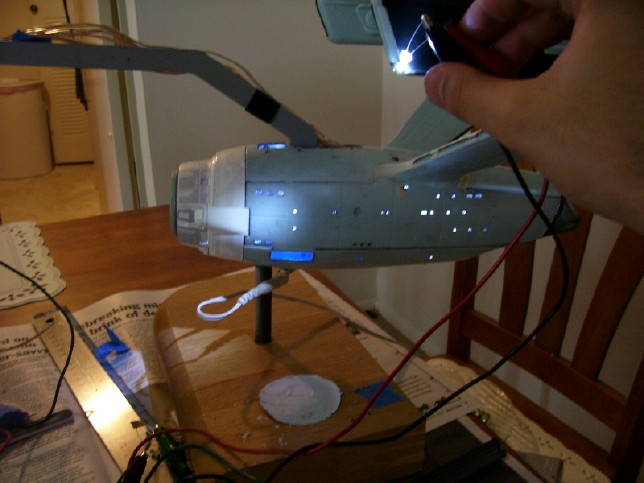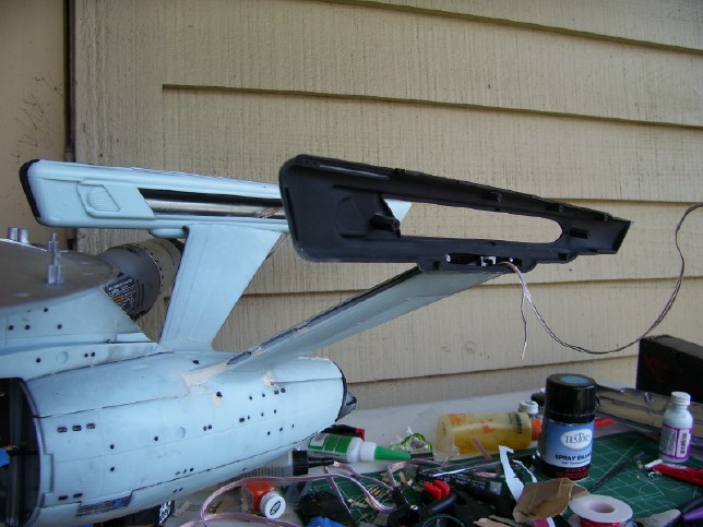 The Nacelles 11 August 2006 With the engineering section lit and assembled, I turned my attention to the warp engine nacelles. In order to make wiring the nacelles easier and to ensure I got the spotlighting effects I wanted, I took an unusual approach with this part of the model. The nacelles mainly consists of two halves. I decided to attach only the inboard half at first, so that I could mount all the LED's and wiring to that half. This would remove the hassle of assembling the nacelle and then having to contend not only with attaching the part to the model, but also making the necessary wiring connections and cramming the excess wire wherever it could fit. To make sure that the nacelles were attached straight and level, I dry-fitted the two halves of the nacelle together and carefully applied cement only to the areas where the inboard half touched the pylon, except for a 1/2" strip along the top of the pylon. In this area, I applied CA. After the glue was applied, I stuck the nacelle to the pylon, made sure the position was good, and hit the CA with a little kicker, setting it instantly. This held the nacelle in place while the cement dried. Fortunately, the armature and the overall good fit of the model meant the nacelles needed very little adjustment (a great improvement over the NX-01 model!). Once the cement had fully cured, I carefully removed the outboard half of the nacelle. and well pleased with the way this product helped to distribute light on the dish, so I hoped that it would do the same for the grills. Above: Here is the nacelle with only the inboard half attached. The long wire is for the strobe at the end of the nacelle an the short one is for the static lighting. Now that the inboard halves were in place, I could start the wiring process. The first order of business was to affix the LED that would serve as the spotlight for the federation pennant on the side of the engineering section. Credibly re-creating this effect was very important to me, and one of the major motivations for attaching the inboard half of the nacelle first. My logic was that if the part the spotlight was attached to was fixed in place, I could be guaranteed to have the spot shine on the right place after assembly. I was originally going to use a 3mm LED for this purpose, but I discovered that a 5mm LED actually gives a more confined spot effect (Don't ask me!). So, this meant that I had to open up the hole in the front of the nacelle a little more than I was originally planning to, but the larger whole isn't really noticeable. The 5mm white LED provides a very good re-creation of the effect seen in the movies. In order to position the light, I applied some CA to the whole, pointed the LED where I wanted it to go, and hit it with a little kicker.