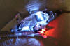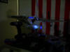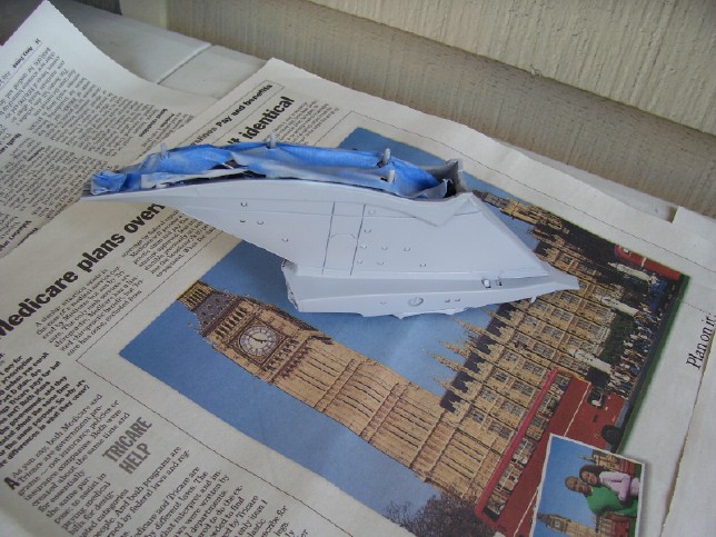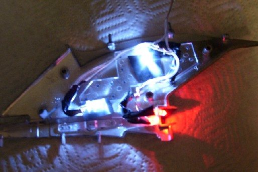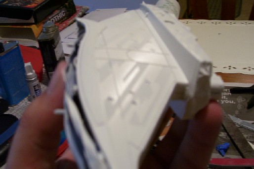 The Neck 28 August 2006 The neck proved to almost sink my project, as I managed to lose half of mine in the process of working on my kit, but fortunately Perfessor Coffee over at the Hobbytalk forums helped me out with an extra he had. With that part, my project was back on track. The neck was also a turning point in that it was the first part of my model to be azteced, and thus was to be a case study for how well my gloss white on flat white approach would look on the actual model. My lighting scheme for the neck is pretty simple. I am using two red LED's to light the photon tubes at the base of the neck, and two white LED's to light the windows. The windows in the neck are filled with a single continuous piece of clear plastic, which makes it easier to light them with fewer LED's. Since I lit and assembled the the neck before painting, I had to mask the top, bottom, and photon launcher areas before I painted the rest of the neck. The first step was to paint the whole neck flat white. It isn't evident from the picture but the flat white came out a light grey color as I didn't apply enough coats and the grey primer shone through a bit.