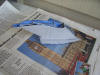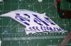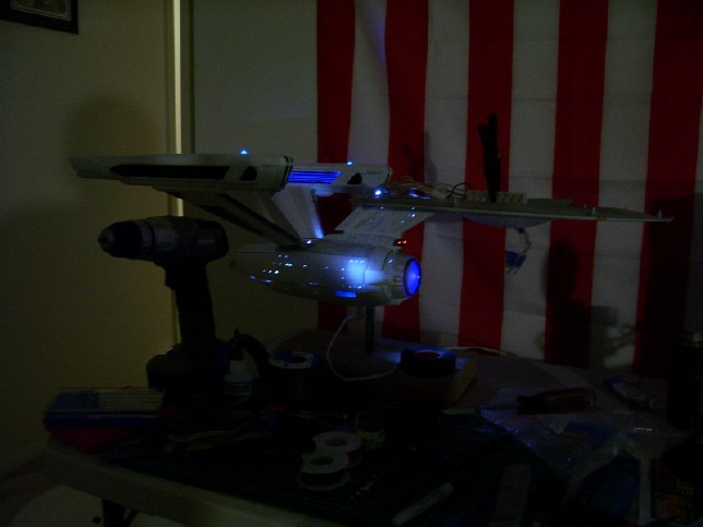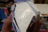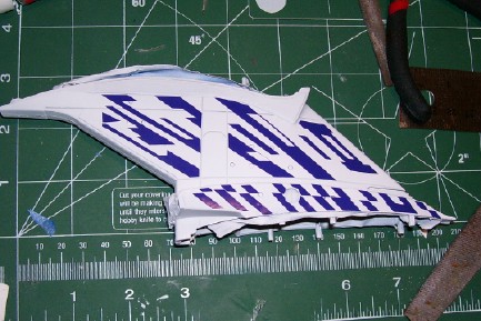 lighting scheme. With the flat white coat down, I could now apply the masks. This is the first part of the model that I've masked, and I discovered that these masks seem to have considerably less "stick" to them than the ones I used on my NX-01. I'm not sure if that is because of the humidity down here in SC, or if the materiel they are made of is actually different, but I'm not complaining. The reduced tack makes it easier to reposition the masks if I misalign them at first, and it also makes it less likely that the mask will remove any of the undercoat when removed. The downside is that the masks want to come un-stuck from the model on their own, so I have to make sure to smooth them down right before spraying the gloss white on. When the masks were removed, the final effect was revealed. I would have to call this an effective test, as the gloss white of the pattern catches the light exactly as I hoped it would. Becuase of the too-light flat white coat, the pattern stands out more than it would otherwise, so I will have to make sure to get a better coat of flat white on the other parts of the model.
