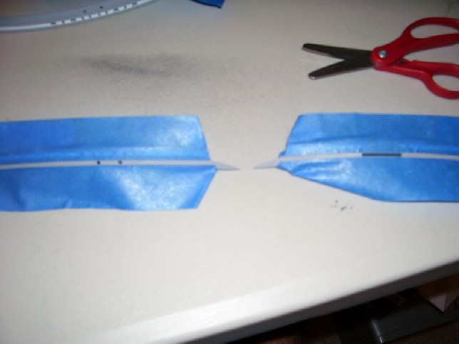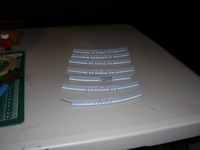 left. After finishing both rounds of masking and painting, I decided that I would re-do the test piece. The fact that I painted it all white first resulted in the white being a bit brighter on that one piece than on the rest. So, to get a more even look I re-primed it and I plan on painting it like I did the other 7. I fitted the two halves of the saucer together so that I could test-fit the rim pieces and see how it looked. I'm fairly happy with the way they came out, but I will need to touch-up a couple of spots to get the bands to blend more evenly at a couple of the joints.
