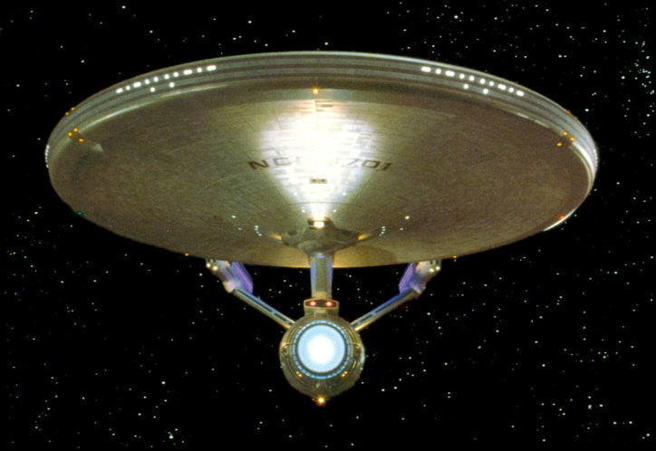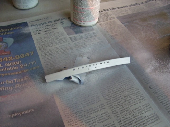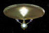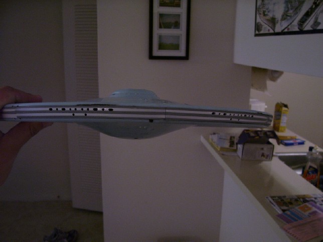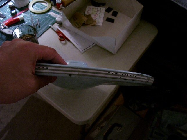 A Set of Rims for the Big E 09 June 2006 Since I'm in a bit of a holing pattern right now has I'm waiting for Trekmodeler's lighting kit to become available, I have decided to tackle several small side projects. One of these is painting the three concentric grey bands around the rim of the saucer. This is one detail that I absolutely want to include in my model, as I feel it adds much to the look of the ship. You can see the bands I'm talking about below. Above: Note the grey bands around the saucer rim. The PL model breaks the rim down into eight separate pieces that fit around the perimeter of the two saucer halves. The bands are actually molded in, which makes the painting a bit easier. I tossed around several ideas on how to go about painting them. First, I though I might be able to just hand-paint them, since they are molded detail. However, I was worried that my shaky hand wouldn't be able to get a clean enough line to achieve the look I wanted. So, that left masking. I considered using liquid mask, but I decided against it as I was worried about getting all of it out of the molded grooves in the rim pieces. I tried a couple of different tapes, but finally settled on plain ol' Scotch blue painter's tape. Since the tape is wide, I would have to mask each piece several times in order to paint each of the separate bands. Thus, it took me about a week to get all of the rim pieces painted. I decided I would take one piece and test my chosen technique. First I primed it with flat grey paint, then painted the whole thing gloss white. Once that was dry, I started masking for the first grey band.